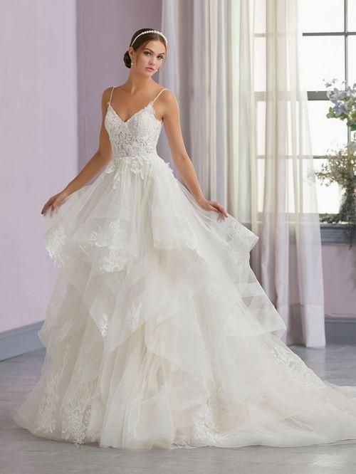 V-neck, spaghetti strap tulle ball gown featuring full lace appliqué bodice and dramatic skirt with multiple layers of tulle and soft horsehair edges.